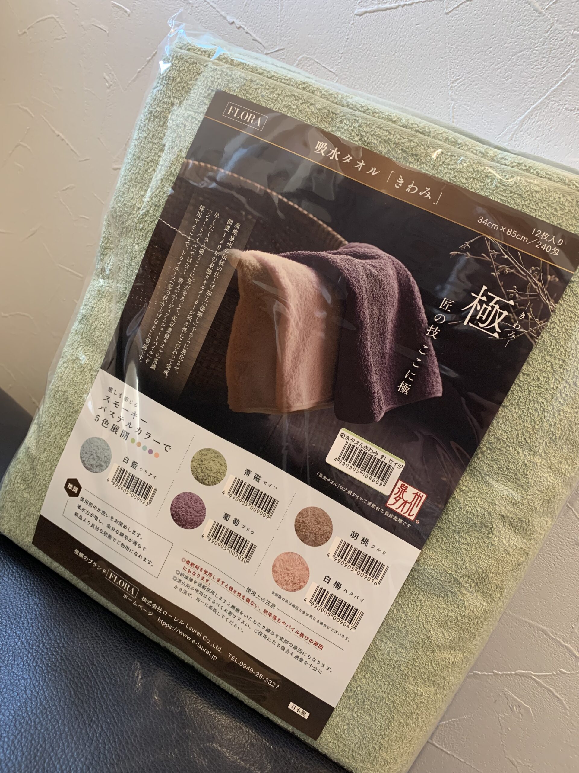世間では抹茶が流行っているらしいので、今回の色は抹茶ミルクみたいな色のタオルにいたしました。笑